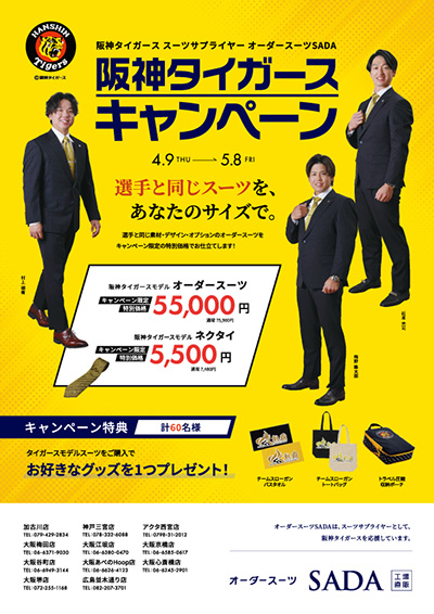 4月9日(木)の阪神甲子園球場での試合は、株式会社オーダースーツSADA協賛“オーダースーツSADA DAY”として開催いたします。