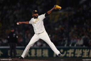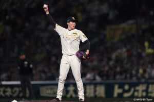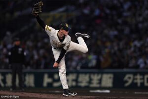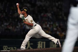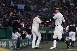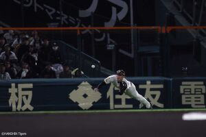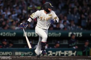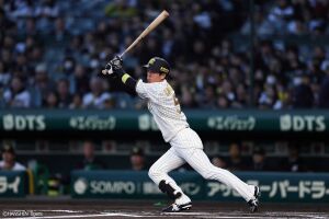 1回裏、先頭の近本は左前安打を放ちチーム初安打を記録する